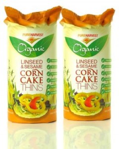 Pureharvest Organic Linseed and Sesame Corn Cake Thins are gluten free, cholesterol free and 97%